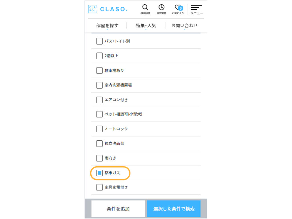 3-1. 都市ガスで検索したい場合は、人気のこだわり条件の都市ガスをクリック